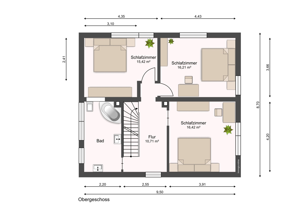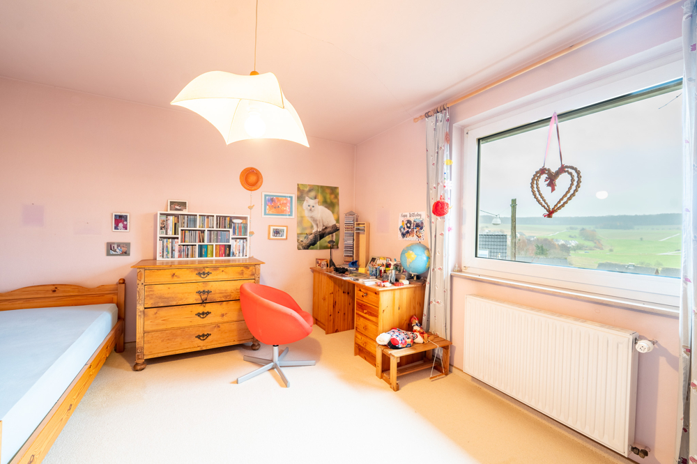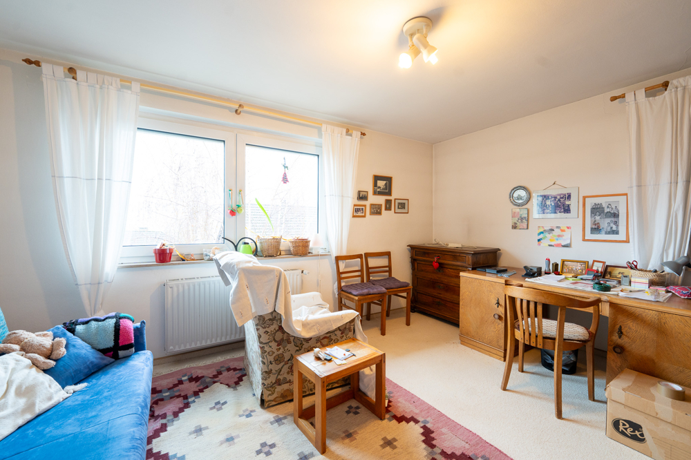 Das Obergeschoss verfügt über drei Zimmer sowie ein großzügiges Badezimmer und bietet ausreichend Platz für Schlafräume, Kinderzimmer oder ein Homeoffice. Die Raumaufteilung schafft eine klare Trennung zwischen Wohnen und Rückzugsort.