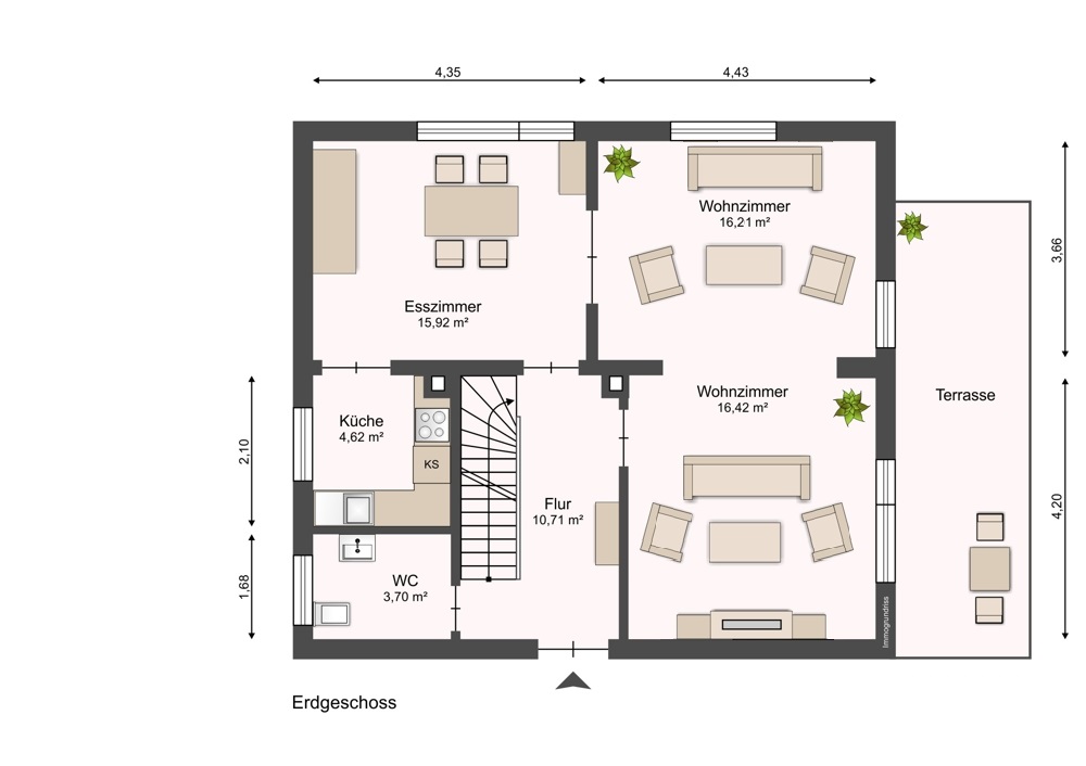 Im Erdgeschoss befindet sich ein großzügiger Wohnbereich mit angrenzendem Esszimmer und Küche. Diese Etage bildet eine offene, kommunikative Wohnetage, die sich gut an individuelle Bedürfnisse anpassen lässt – ideal für das gemeinsame Familienleben oder gesellige Stunden.