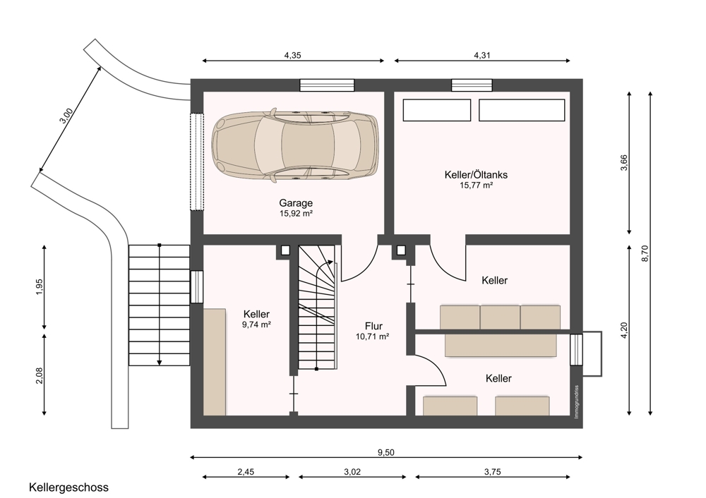 Im Kellergeschoss stehen drei separate Kellerräume zur Verfügung. Besonders praktisch ist der direkte Zugang zur Garage, der den Alltag spürbar erleichtert und zusätzlichen Komfort bietet.