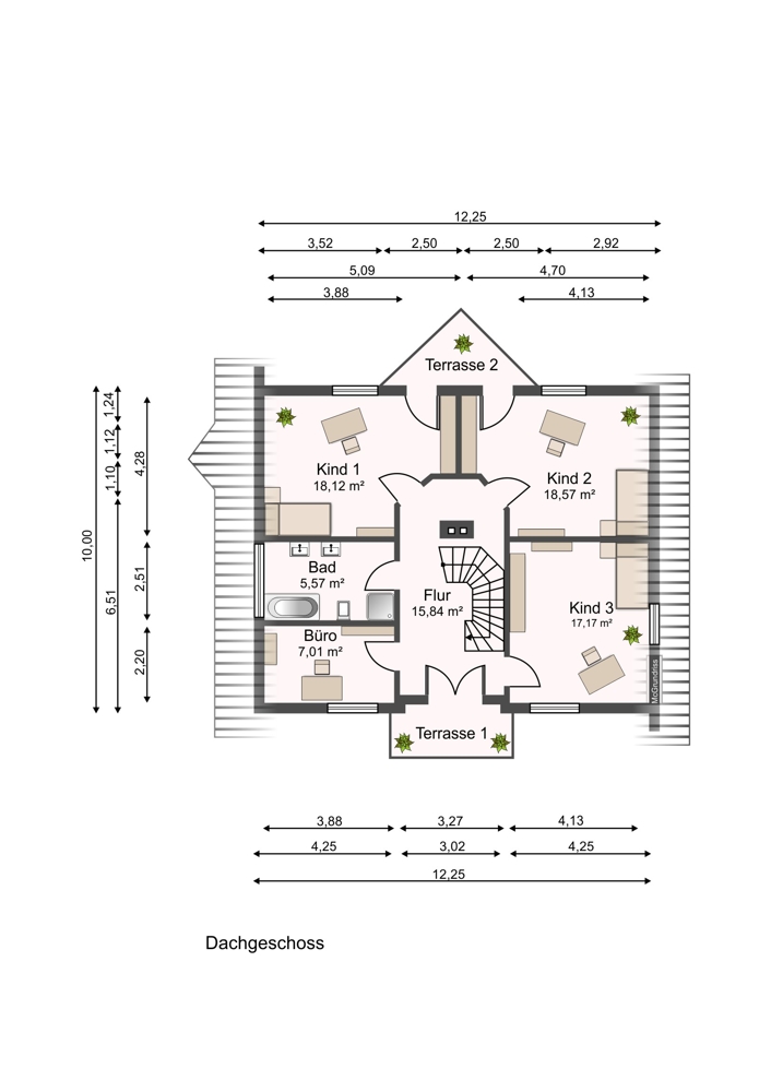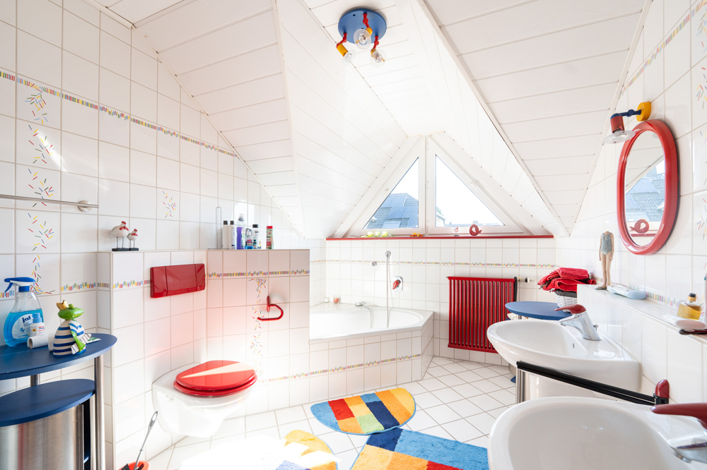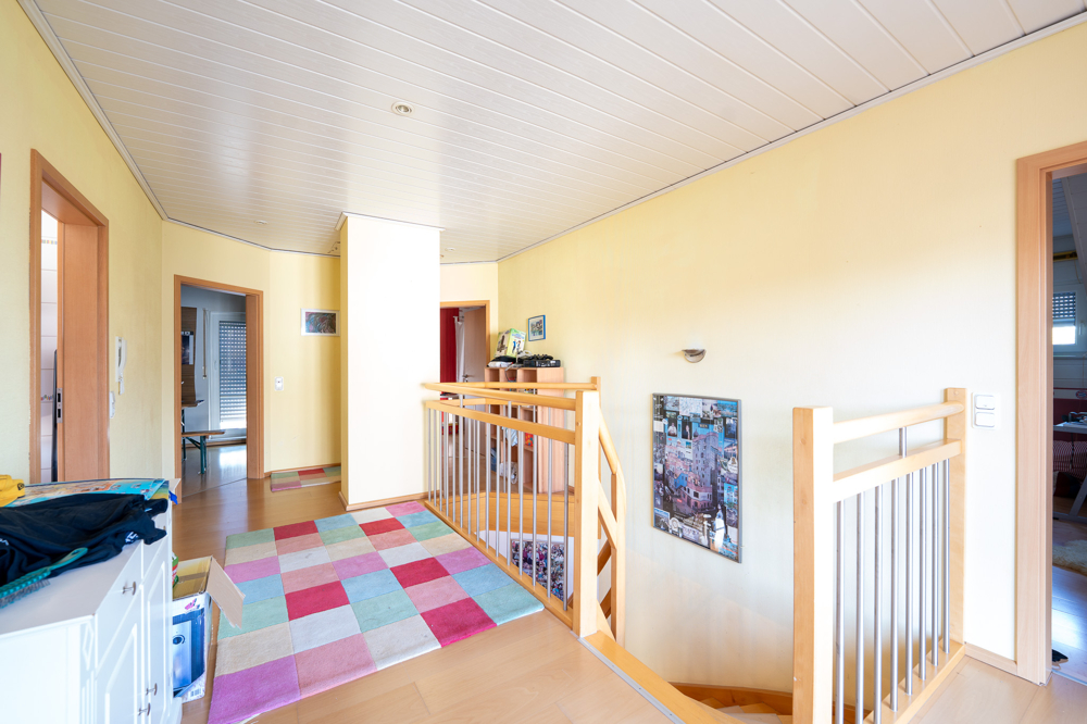 Ein Ort der Ruhe und Rückzugsmöglichkeiten bietet das Dachgeschoss. Vier gemütliche Zimmer bieten individuelle Gestaltungsmöglichkeiten – ob als Kinderzimmer, Homeoffice oder Gästequartier. Das große Badezimmer sowie zwei Balkone unterstreichen den hochwertigen Charakter dieser Etage.