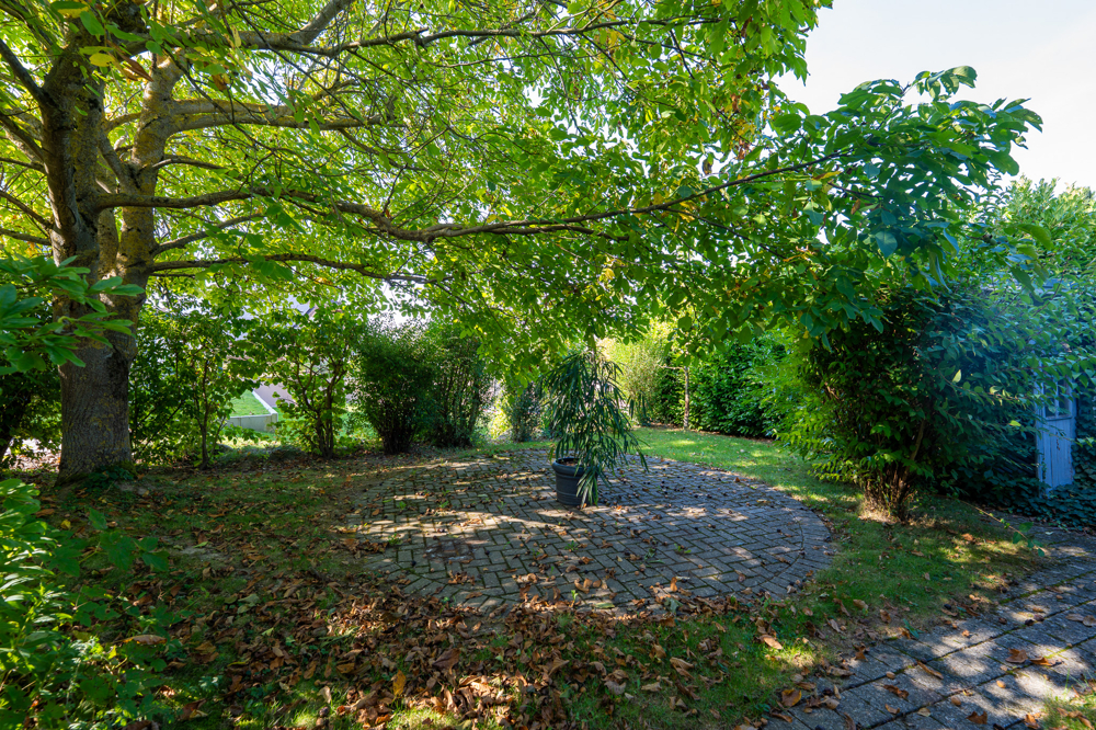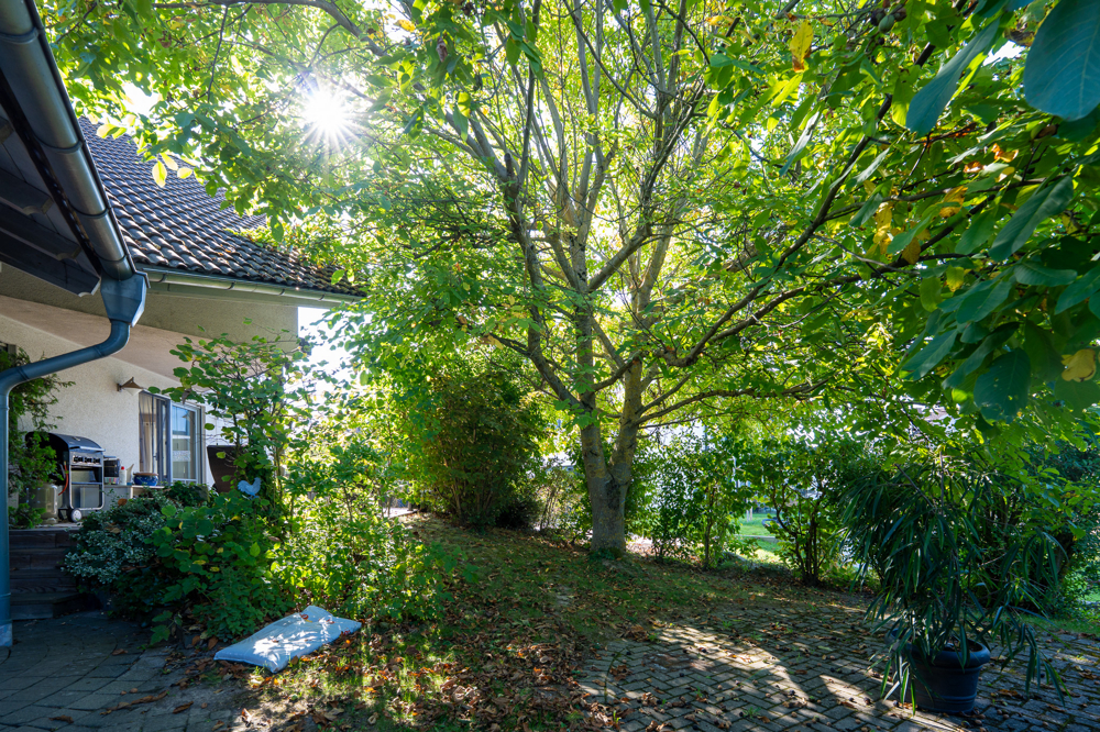 Der Außenbereich rundet das Gesamtbild ideal ab: Eine liebevoll angelegte Terrasse mit Sichtschutz schafft eine grüne Oase der Ruhe, während das eingewachsene Grundstück Privatsphäre und Naturerlebnis in Einklang bringt. Eine geräumige Garage sorgt zusätzlich für Komfort und sicheren Stellplatz.