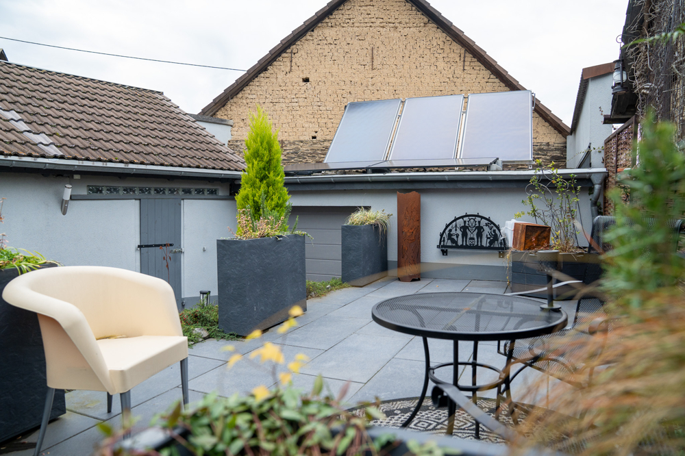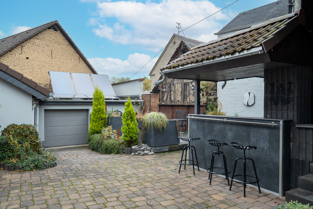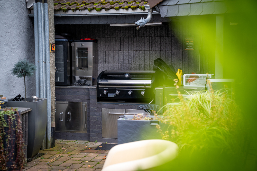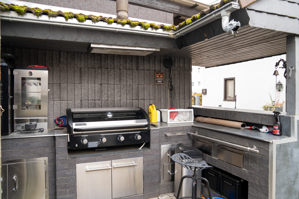 Im Hof setzt sich dieses Konzept fort: Dort befindet sich eine Outdoor-Küche mit Theke, ergänzt durch eine großzügige Terrasse mit Grillplatz. Ein Bereich, der in den wärmeren Monaten zum Mittelpunkt wird und Gourmet-Herzen höherschlagen lässt – echter Komfort und durchdachter Luxus im Außenbereich.