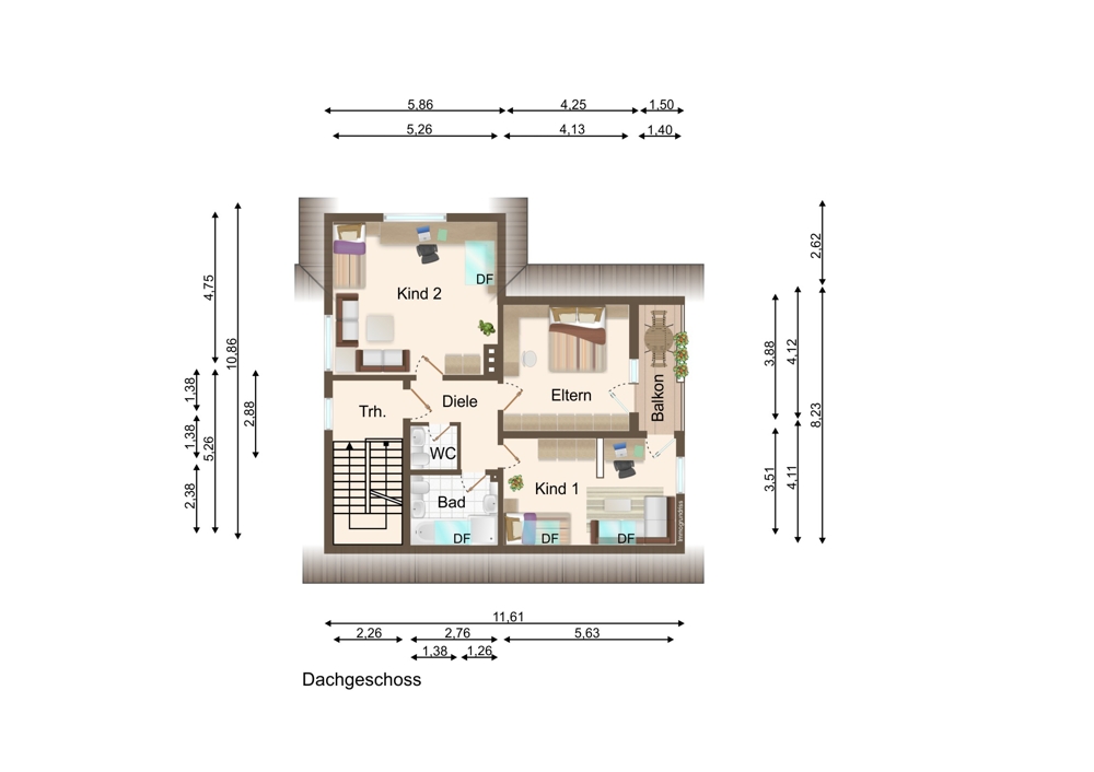 Das Dachgeschoss bietet reichlich Platz für die ganze Familie. Zwei Kinder- und Jugendzimmer schaffen Raum zum Spielen, Lernen und Entfalten. Das Elternschlafzimmer mit eigenem Balkonzugang lädt zu entspannten Stunden ein. Ein großzügiges Badezimmer rundet diese Etage ab.