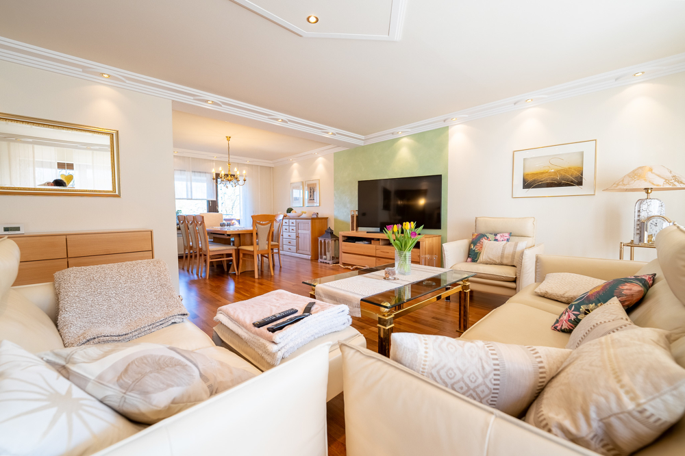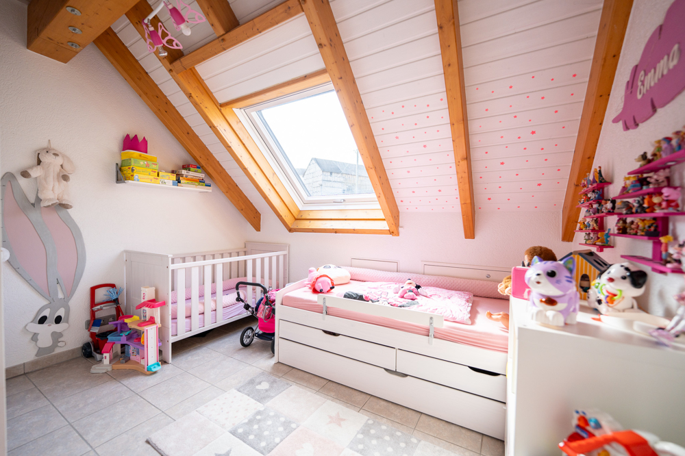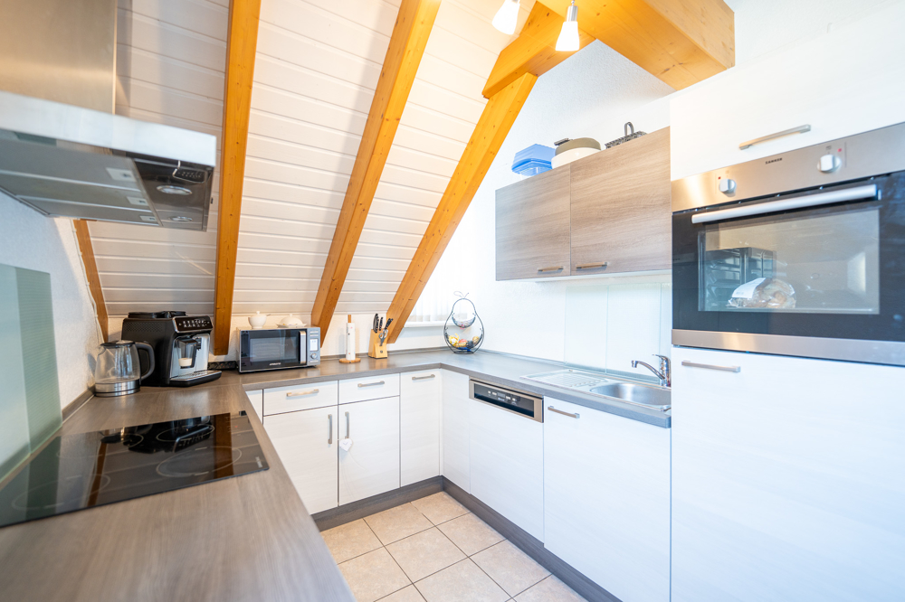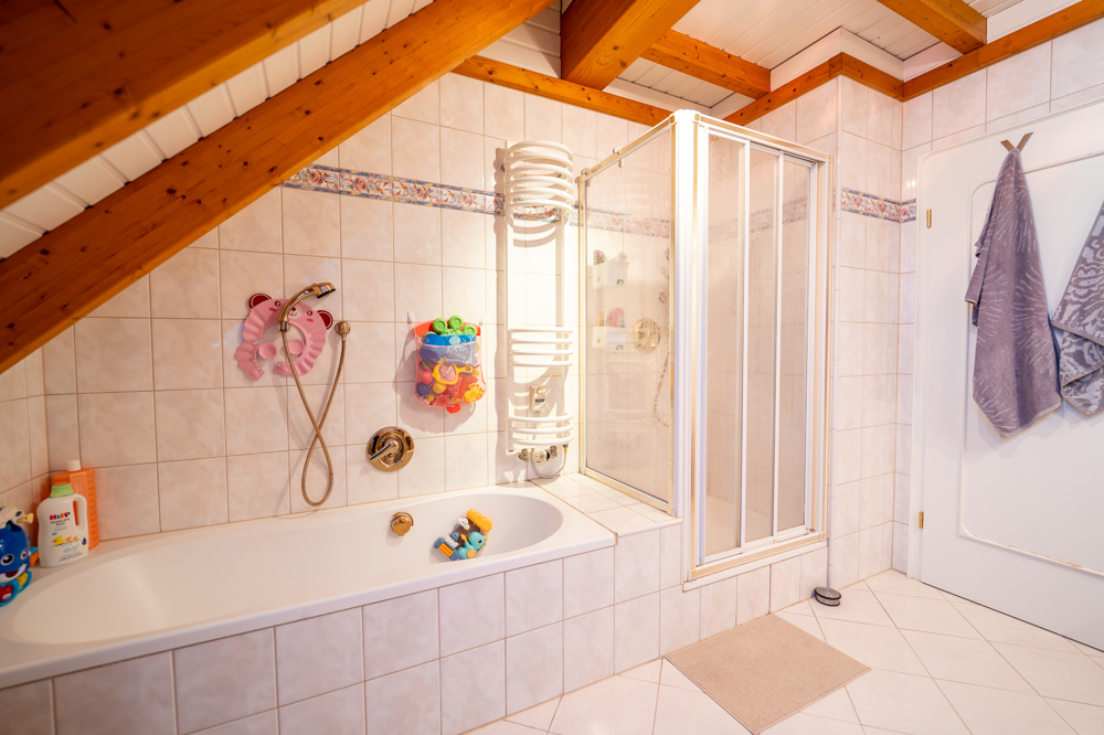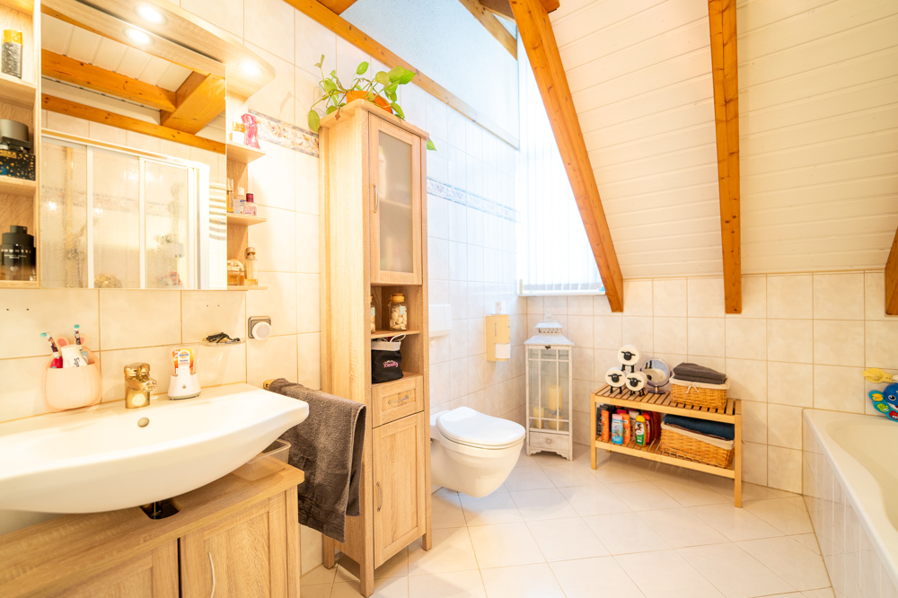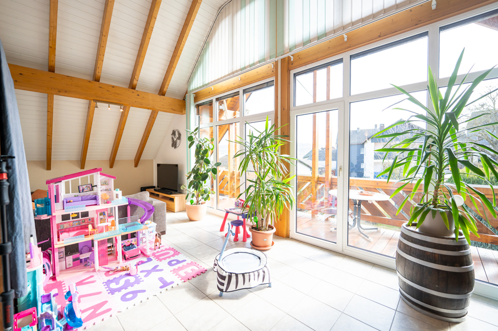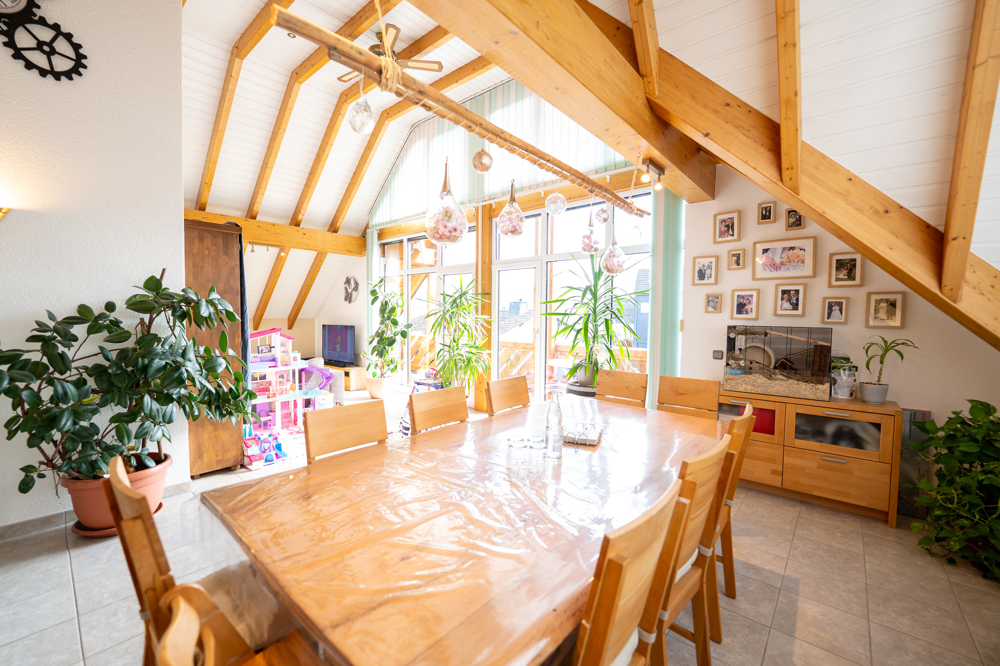 Die Einliegerwohnung im Dachgeschoss ist aktuell gut vermietet. Sie kann aber vielseitig genutzt werden, z. B. für Eltern oder Kinder im selben Haus. Auch eine Nutzung als Büro für Selbstständige wäre denkbar. Sie besticht durch großzügige Gestaltung, große Fensterflächen und eine verglaste Giebelseite, die für ein helles und freundliches Ambiente sorgt.