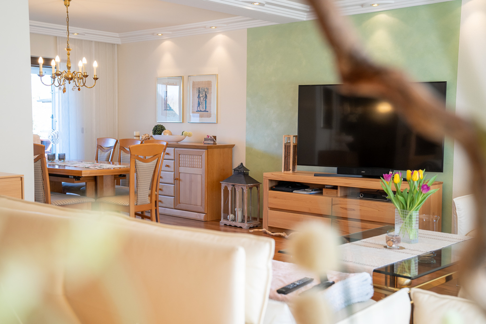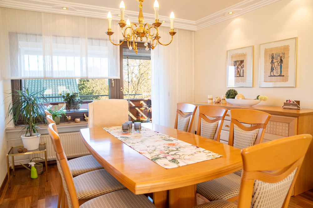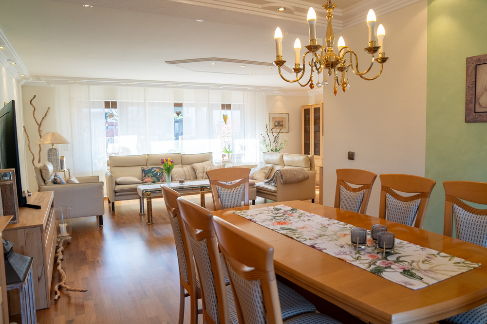 Die Hauptwohnung im Erdgeschoss und Gartengeschoss bietet helle, gut geschnittene Zimmer und viel Platz fürs Familienleben. Große Fensterflächen sorgen für freundliche Atmosphäre und schaffen ein angenehmes Wohnklima.