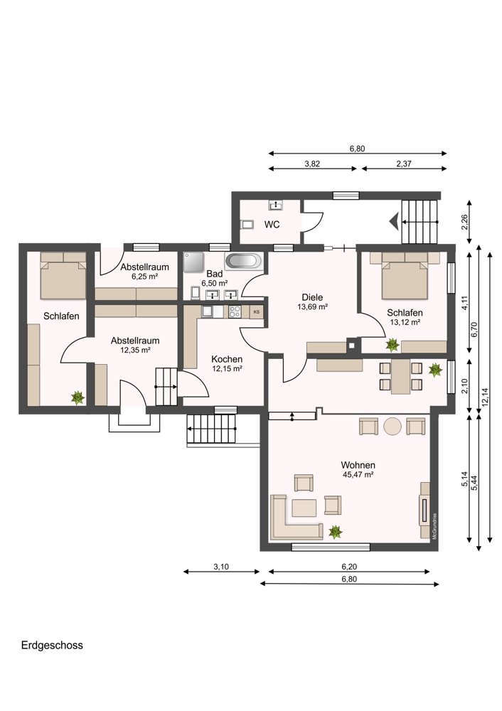 Wir weisen darauf hin, dass vorhandene Grundrisse nicht maßstabsgetreu sind, Maße, Angaben und Details abweichen können. Für die Richtigkeit, Vollständigkeit und Aktualität der Angaben können wir keine Gewähr übernehmen, auch nicht für mögliche Folgenutzungen der Immobilie.