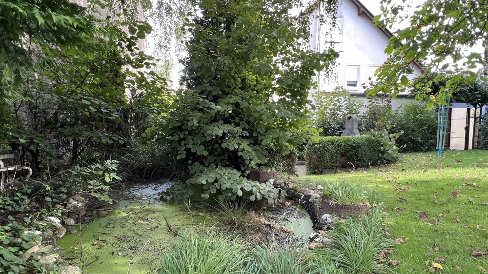 Ein separater Gartenbereich ist mit einer Grillecke und einem Teich angelegt.