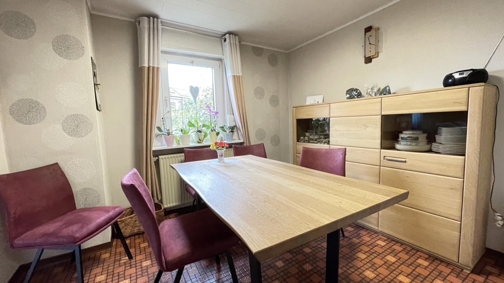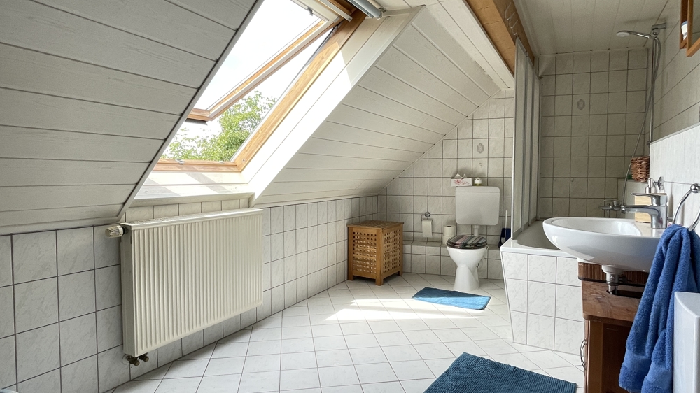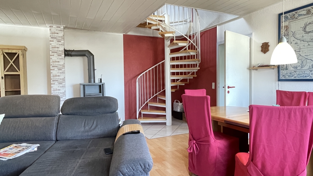 Das Obergeschoss ist über die Treppe im Flur zu erreichen. Aufgrund der vorteilhaften Aufteilung ist es möglich, dies bei Bedarf als separate Wohneinheit zu gestalten. Hier befindet sich eine Küche mit angrenzendem Esszimmer und weiterem Durchgang zu dem großzügigen Wohnbereich. Weiterhin verfügt diese Etage über ein Schlafzimmer und ein Tageslichtbad mit Badewanne.