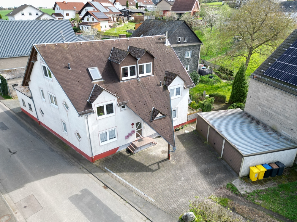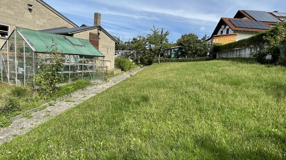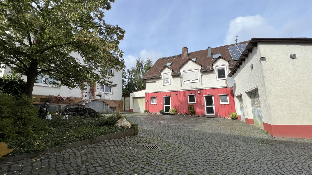 Auf dem 2.000 m² großen Grundstück befindet sich ein Zweifamilienhaus mit einem angrenzendem Mehrfamilienhaus, einer Halle (ehem. Scheune) und mehreren Garagen.